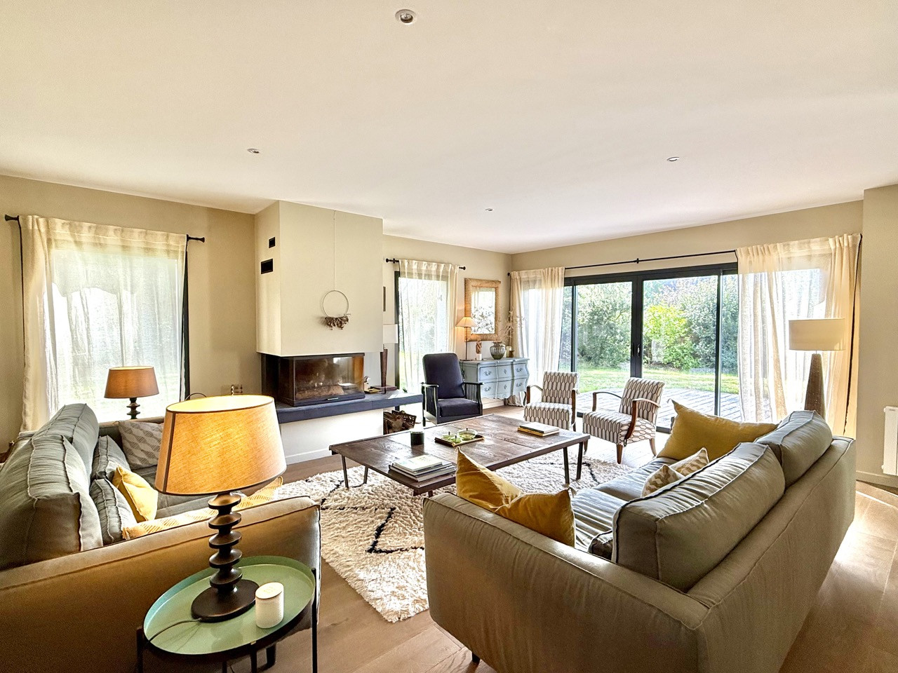 The bright and airy living room, complete with a cozy fireplace, opens directly onto the terrace and landscaped garden. A large modern kitchen, fully equipped for your culinary needs, flows into a welcoming dining area where you can gather and share meals. For relaxation, enjoy the TV lounge with a big sofa or settle into the dedicated workspace if you need to catch up on work.