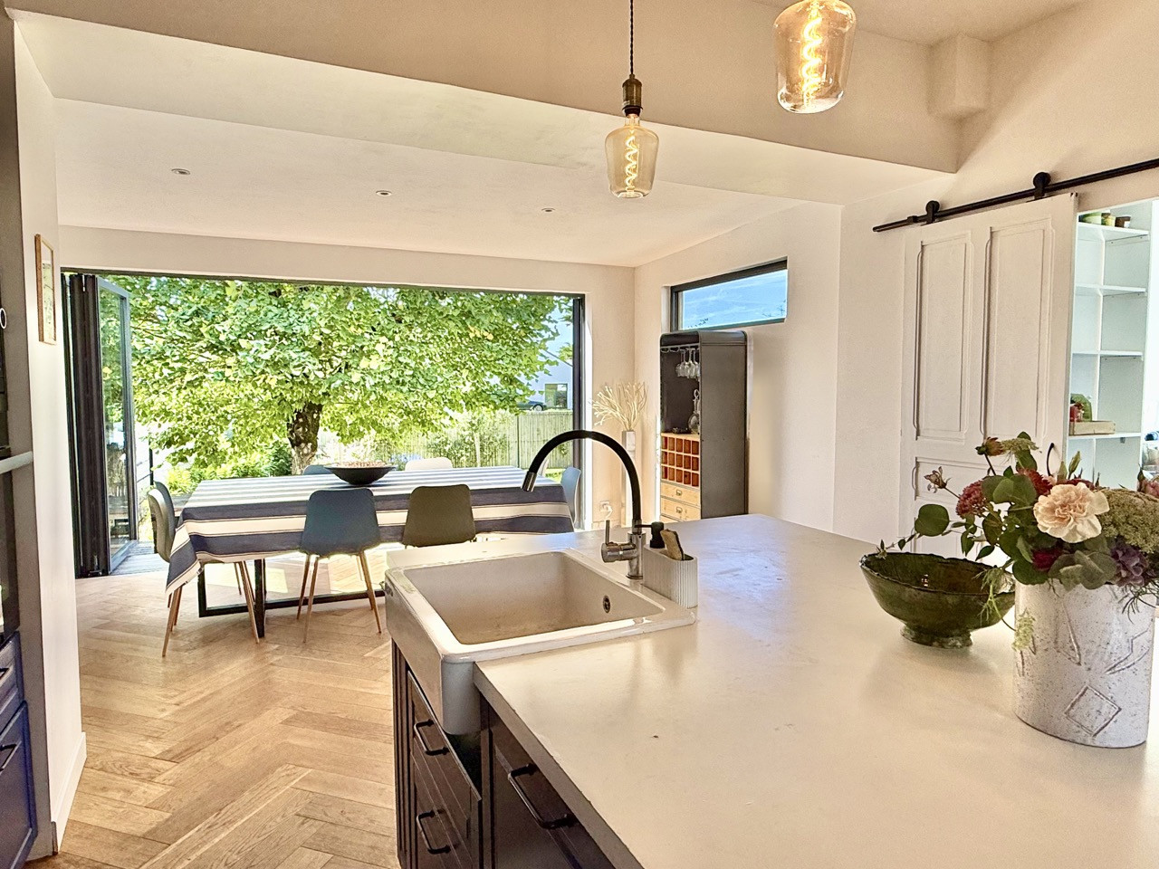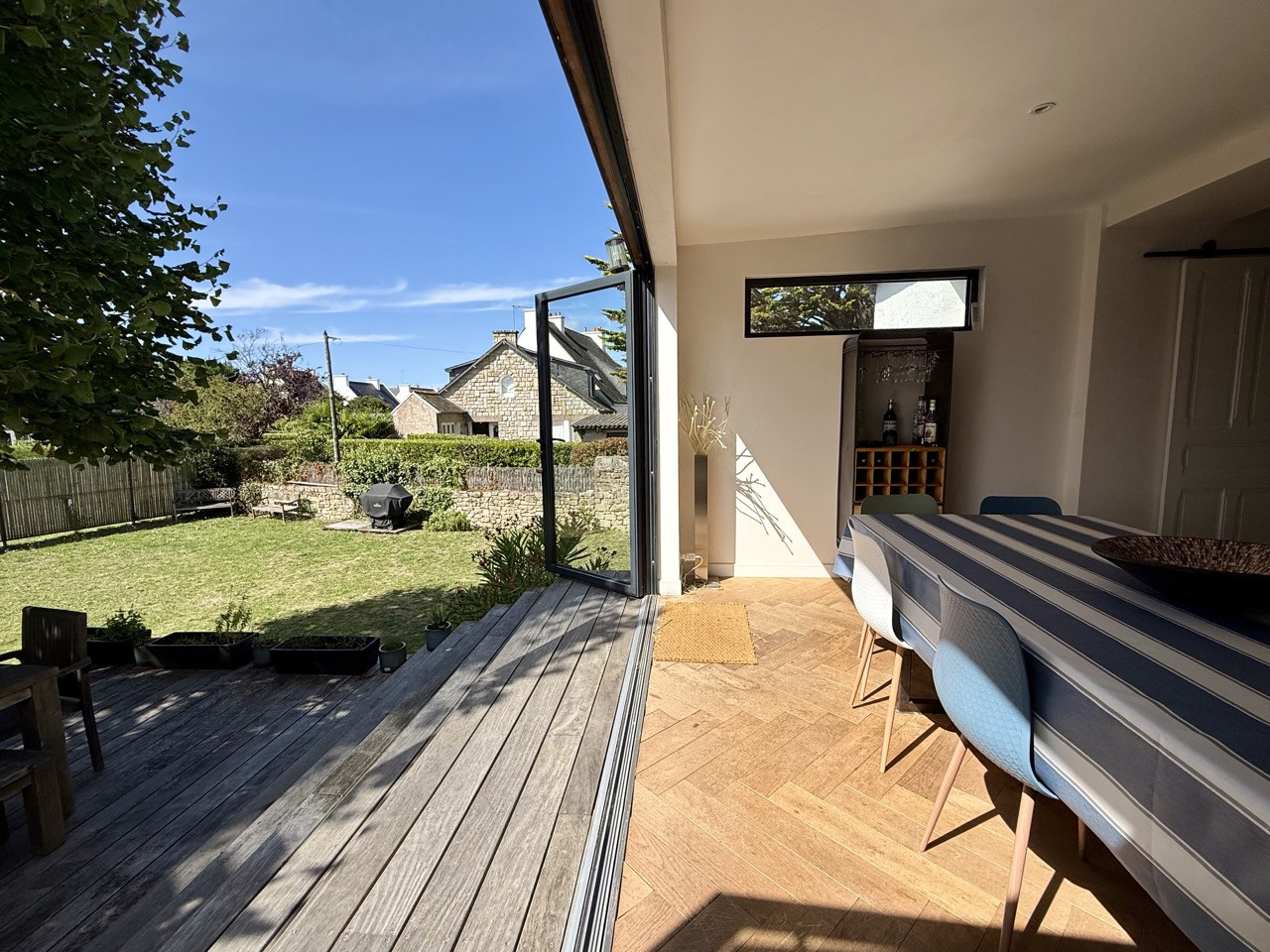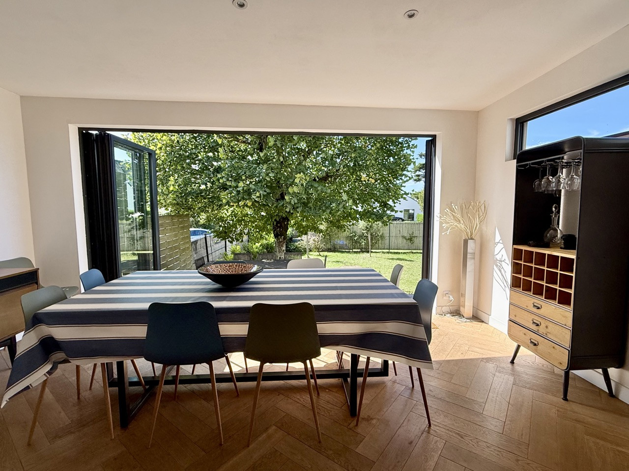a dining area opening onto a large folding bay window leading to the outdoors.