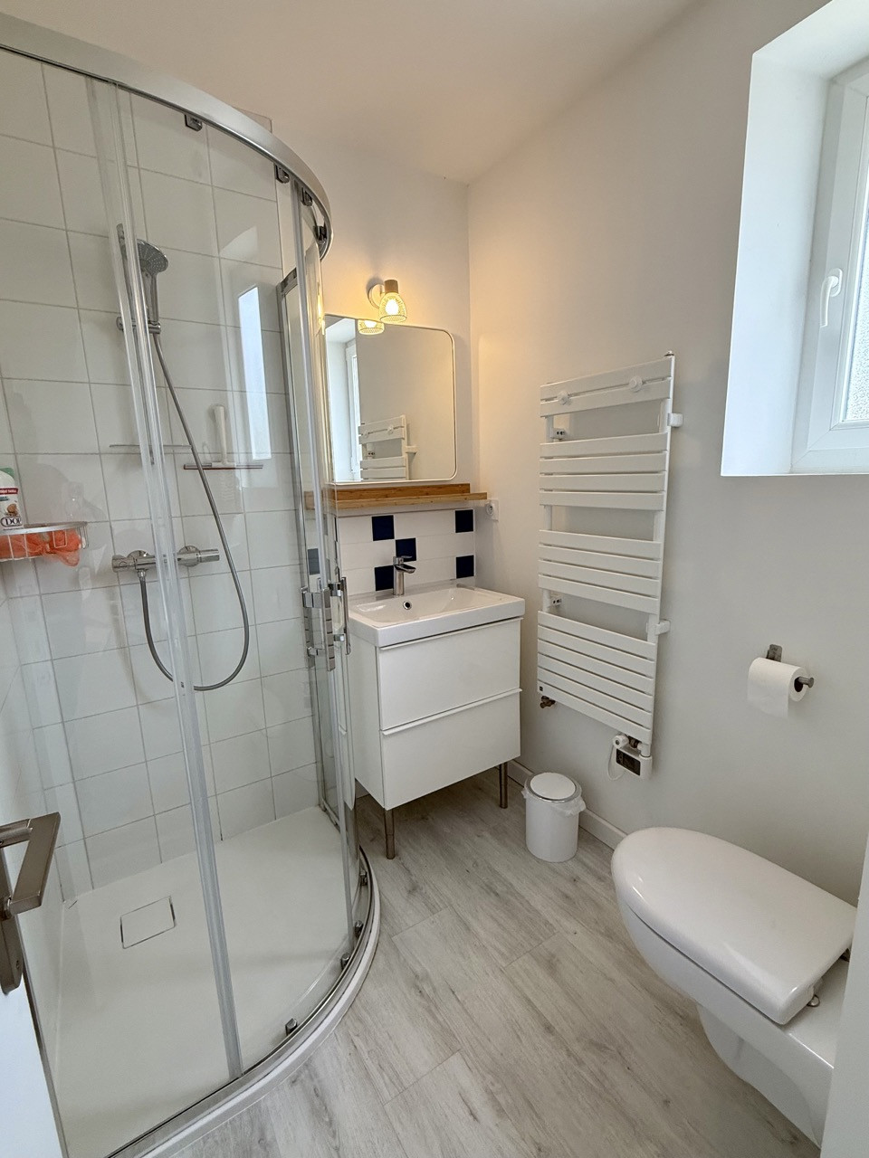 Un espace média (avec TV et lit supplémentaire) complète le rez-de-chaussée, ainsi qu’une buanderie et une salle d’eau (douche et WC).