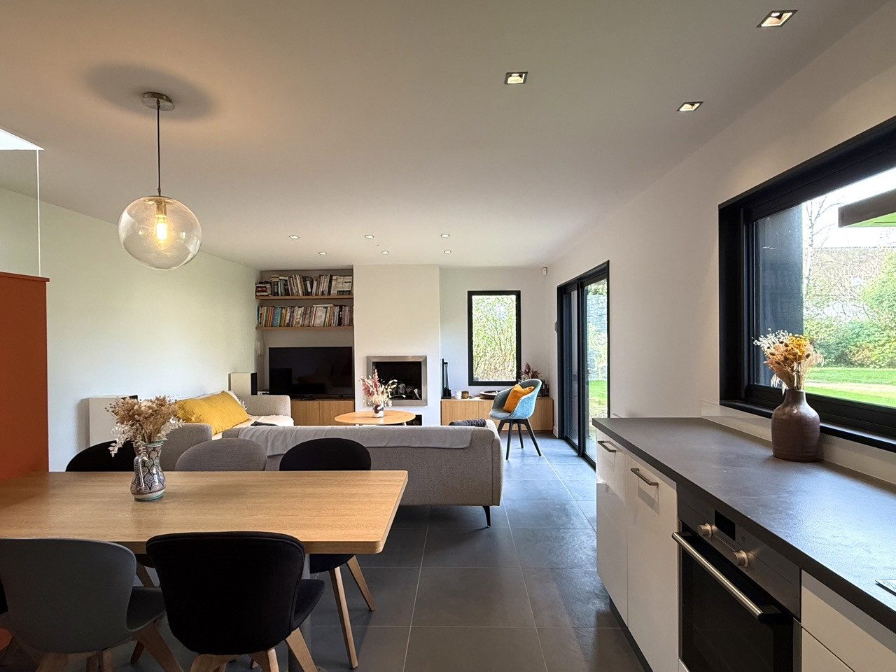 Grande cuisine moderne entièrement équipée, ouverte sur un espace repas convivial
